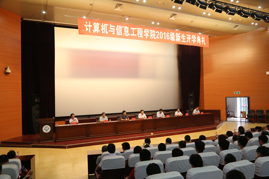 9月4日上午,计算机与信息工程学院2016级新生开学典礼在金明校区图书馆一楼报告厅举行。学院领导班子成员、全体教师以及530余名研究生和本科生新生参加开学典礼,典礼由学院党委副书记孔涛主持。
