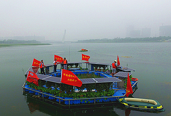 在野外试验现场,苗琛和方蒙认真听取了该项目负责人,化学化工学院王新海博士研究团队部分成果的产业化情况,以及正在进行产业化的多效立体富营养化集成处理系统的研究进展。随后,大家乘船登上了由学院师生自建的人工浮岛,现场观看了系统核心区域运行状况,并与正在进行监测和调试作业的研究生进行了亲切的交流。