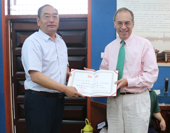 我校经济学院院长宋丙涛致欢迎辞。孙君健为Auerbach、Nishimura教授分别颁发河南大学客座教授聘书。