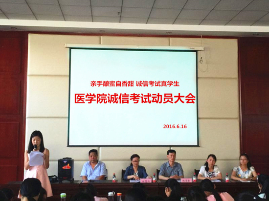 四六级、期末考试来临之际,为严肃考风考纪,弘扬医学院的传统优良学风,6月16日中午,医学院在药学院报告厅举行了“亲手酿蜜自香甜 诚信考试真学生”诚信考试动员大会。学院有关负责人、全体学生参加了动员大会。