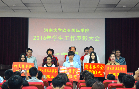 为倡树典型,凝聚士气,推进学生工作,2016年5月19日下午,欧亚国际学院在学院二楼报告厅举行2016年学生工作表彰大会。学院全体党政领导出席,获奖学生代表、各班级学生代表150余名参会,欧亚国际学院副院长王敬学主持表彰大会。