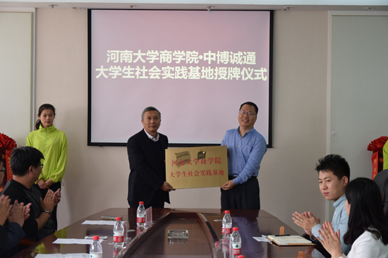 4月25日上午,商学院•中博诚通大学生社会实践基地授牌仪式在商学院五楼院史馆举行。北京中博诚通国际技术培训有限责任公司董事长毛金明、中博诚通相关主管,河南大学商学院院长、博士生导师王性玉,学院相关负责人出席会议。仪式由吕英建主持。