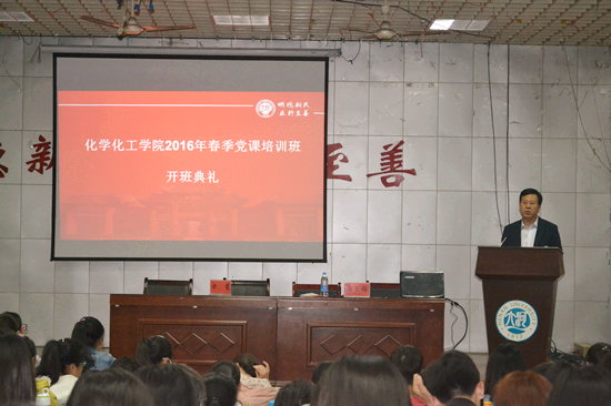 为加强对入党积极分子的培养和教育,端正入党动机,提高思想觉悟,充分发挥入党积极分子在学习、生活、工作中的先进性。4月21日下午,化学化工学院2016年春季党课培训开班典礼在学院学术报告厅举行。学院全体学生党员及入党积极分子参加本次典礼,典礼由本科第二党支部书记吴玉锋主持。