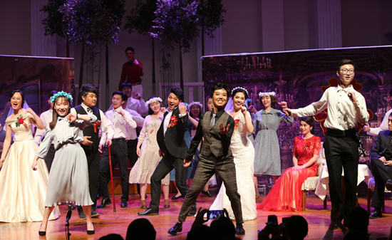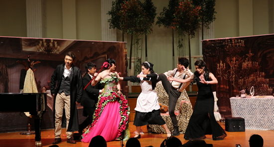 晚上7点,音乐厅座无虚席,歌剧在华丽的序曲中拉开了帷幕。为了帮助中国观众更加深刻地理解西洋经典歌剧,导师韩梅教授带领研究生大胆创新,旨在用中国人的理解诠释西方经典歌剧,坚持“低成本、小制作、高水平”。作为歌剧表演,为忠实原著,所有演唱用意大利语,利用这部歌剧的喜剧色彩,巧妙地插入中国元素,如将歌剧的宣叙调部分替换为中文朗诵形式的‘画外音’;演员恰到好处地偶尔插入的几句河南话;婚礼背景墙上的大红喜字;村民狂欢时《小苹果》舞蹈的插入等,不仅不显得突兀,反而增加了歌剧的喜剧成分,较好地吸引中国观众的共鸣。演出之后,举行了简短的学术研讨会,河南省文联副主席、省音协常务副主席、艺术学院艺术硕士职业导师李仲党等河南省内音乐界的专家均对该剧给予了极高的评价,认为这是一场可以代表河南省艺术硕士水平的表演。