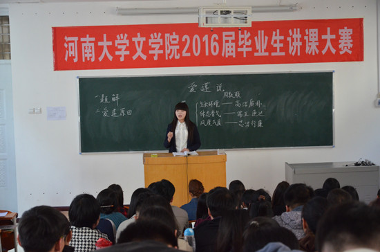 一支粉笔书写激扬青春,三尺讲台尽显学子风采。3月31日下午,文学院2016届毕业生讲课大赛在文学院一楼阶梯教室拉开帷幕。文学院相关领导老师到场指导,大赛特邀河南大学附属中学高级教师、文学院硕士生导师徐砚田,文学院教师许兆真、蔡玉芝、郑慧霞、王银辉等担任大赛评委。