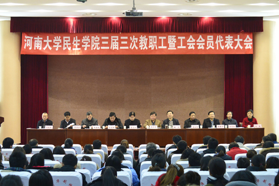 2016年1月7日上午,民生学院在艺术楼一楼报告厅召开第三届三次教职工暨工会会员代表大会。河南大学工会主席朱恒宽,学院领导班子全体成员,全院教职工及工会会员代表与会。大会由院党委常务副书记刘道衔主持。