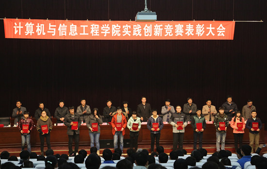 12月11日下午,计算机与信息工程学院第五届创新实践竞赛表彰大会在金明校区图书馆一楼报告厅举行。校党委副书记王凌、副校长刘先省、校工会主席朱恒宽及学生工作部(学生处)、校团委、教务处等部门负责人出席了表彰大会,学院党政领导班子、师生代表500余人参加了会议。会议由学院党委副书记孔涛主持。