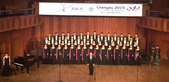 由中国合唱协会主办,成都市锦江区承办的第十三届中国合唱节于2015年10月26日至31日期间在四川成都举行,以纪念中国人民抗日战争胜利暨世界反法西斯战争胜利70周年为主题,来自全国各地的55支优秀合唱团、近3000人参加了比赛。河南大学学生合唱团经省音乐家协会、省合唱协会推荐,在艺术学院领导班子的大力支持下,由副院长韩梅教授任团长,冯安君副教授、程瑞雪老师任声乐指导,青年教师袁凯担任指挥,历时两个多月的紧张排练,精心准备了《涅槃》、《Northen Lights》和《梦里失落的家乡在呼唤》三首高难度混声合唱作品参与比赛。在激烈的角逐中,合唱团员凭借良好的精神风貌和富有感染力的表演赢得了在场评委和观众的一致认可和好评,充分展示了我校合唱表演的实力。赛后,合唱团员们激动万分,兴奋地含泪高唱校歌,真情的演唱吸引了四川音乐学院院长作曲家林戈尔教授驻足聆听,评价道:“比赛中河南大学学生合唱团充分地展现了合唱艺术的魅力,欢迎大家常来四川演出,把美好的音乐带给我们。”