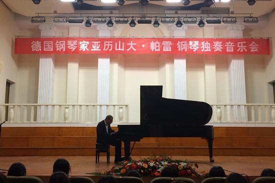 10月9日晚,德国博兰斯勒殿堂级钢琴家亚历山大•帕雷2015环球钢琴之旅中国站在我校艺术学院音乐厅举行。此次音乐会由德国博兰斯勒钢琴有限公司主办,河南大学艺术学院音乐与舞蹈分院承办,郑州佳音琴行协办。