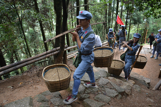 “小心,下雨路滑,大家都慢点”,“大家靠里走,前方有碎石……” 8月14日,在全国青少年井冈山革命传统教育基地现场教学点,14名来自河南大学民生学院身着浅蓝色红军服的大学生学员正在上一堂特色情景体验课——“红军的一天”。