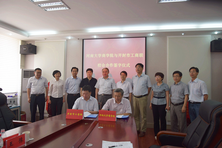 2015年5月27日上午,商学院与开封市工商联校会合作签约仪式在商学院五楼院史馆举行。开封市委统战部、市工商联主席、河南新龙集团有关负责人以及校机关、商学院相关领导出席了签约仪式。仪式由该院党委书记杨俊中主持。