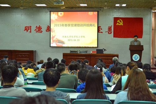 为加强化学化工学院入党积极分子的培训和教育,提高党员师生的理论学习和思想觉悟。4月23日下午,化学化工学院2015年春季党课培训开班典礼在学院学术报告厅举行。学院全体教工党员、学生党员代表及入党积极分子等近400名师生参加典礼。学院党委副书记王志乾主持开班典礼。