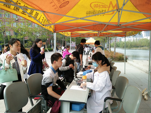 在测血压专区,青年团员细心而又忙碌的为前来同学测量血压,并告知其所测血压值、血压正常值范围、低血压和高血压范围。对低血压及血压偏高者,嘱咐他们饮食搭配运动改善身体的健康状态来维持正常血压。