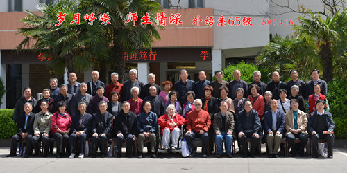 65级校友们对校领导的亲自出席表示感谢,并向外语学院赠送了《岁月峥嵘 师生情深》的牌匾,以寄托他们对母院的感激之情。五位校友代表朗诵了65级校友艾振兴创作的诗歌《同窗情》,饱含深情、质朴醇厚的诗句打动了在场的每位校友,也为65级返校聚会画上了圆满的句号。