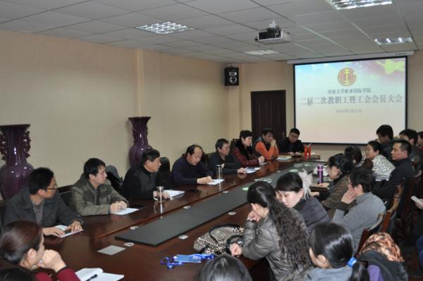 2015年1月21日下午,欧亚国际学院在三楼会议室召开二届二次教职工暨工会会员大会。学院领导班子成员、全体教职工和工会会员与会,大会由学院副院长、工会主席王敬学主持。