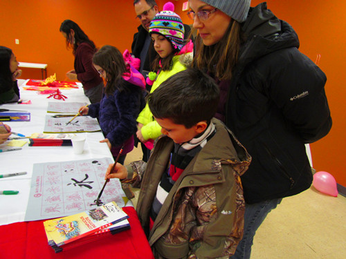 当天阿克伦阳光明媚,阿克伦孔子学院一行人迎着2014年最后的一抹阳光早早地来到展厅,布置会场。步入中国文化展厅,鲜艳的五星红旗、腾飞的小龙、“福”、对联、油纸伞、文房四宝、毽子、空竹等洋溢着辞旧迎新的中国风。孔子学院向参观中国展厅的市民都赠送一张孔子学院的贺年片以及他们自己的汉语名字,让参观者亲身体会到汉字的魅力。展厅内还精心布置了一面剪纸展墙,吸引了众多市民拍照。孔子学院中方人员现场展示 “囍”、立体“春”、汉服、中国结等手工制作过程,有兴趣的市民纷纷跟着学做,当他们亲手剪出一个个窗花的时候,当他们剪出特色各异的立体“春”的时候、当他们亲手编出自己独特的中国结的时候,当他们全家兴高采烈的舞动中国“龙”的时候,当他们惊奇的发现自己也能把中国“空竹”抖起来的时候,当他们把中国“毽子”高高踢过头顶的时候,中国印象就深深的烙在了他们心间。参与的市民为了得到自己心仪的奖品,积极参加各种小竞赛活动,把活动一次次推向高潮,为本次迎新年活动画上圆满的句号。