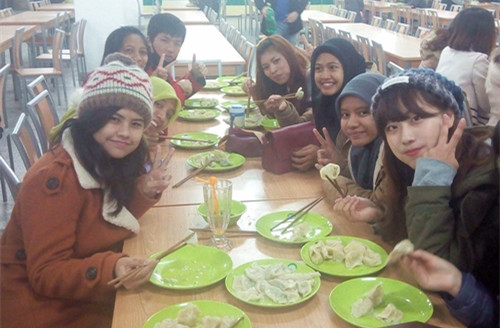看到同学们犯了难,在场的老师们便开始手把手地教同学们如何包饺子。看着饺子皮和饺子馅在老师的手中很快变成了一个个漂亮的饺子,留学生同学们也像模像样的包了起来。“我不会包中国的饺子,但是我会包意大利的饺子”,来自瑞士的于连同学向我们展示了他的作品——一个像半张披萨饼的饺子。“我的饺子是吉尔吉斯斯坦饺子,上面有很多的花边”——来自吉尔吉斯斯坦的梦璐同学向我们展示了她的作品……在包饺子的过程中,留学生并不拘泥于老师们给的范例,而是大胆的加入了自己的想象。于是,在长长的操作台上,诞生了来自世界各地的、形态各异的饺子。师生们纷纷拍照留念,记录下这些难得的瞬间。