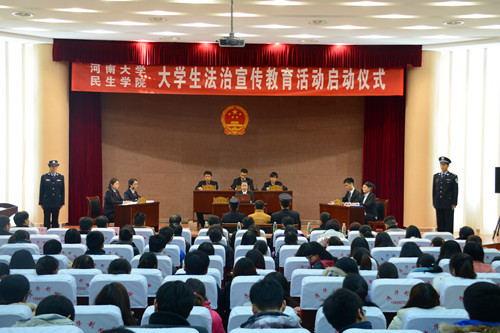 为庆祝我国首个国家宪法日,弘扬法治精神,加强法治宣传,增强学生法制意识,2014年12年4日下午,民生学院在学院艺术楼报告厅举行法治宣传教育活动启动仪式,成立河南大学民生学院法律协会,开展模拟法庭活动。民生学院领导李文山、魏剑、张国梁、王天仕出席。开封市中级人民法院民一庭庭长任晓飞、未成年人案件综合审判庭庭长王学庆、法官段俊英,河南大学法学院民商法教研室樊涛、诉讼法教研室姚显森老师受邀参加活动。