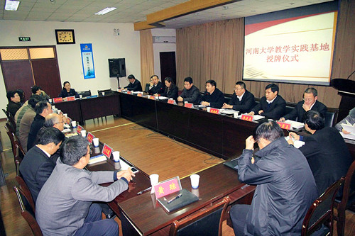 张海民与鲍鹏代表双方签署了校企合作协议,并为“河南大学实践教学基地”揭牌。