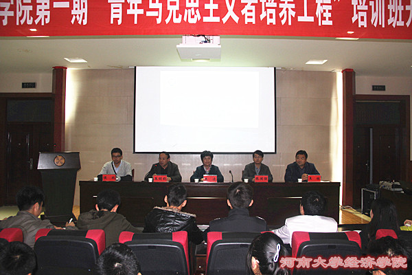 伴随着欢快而振奋人心的团歌,河南大学经济学院第一期“青年马克思主义者培养工程” 培训班拉开帷幕。由班主任侯雨老师宣读培训班的组织机构。2013级学生孙煜代表全体班级成员发言。他首先向老师们表示感谢,并庄严地做出承诺:学好理论知识,树立坚定的理想信念,将理论与实践结合,提升自身综合素质,为学院、学校的建设与发展助力。