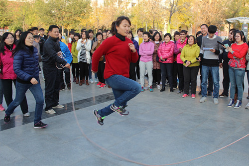 在团体跳大绳比赛中,每组五名教师一名学生连续配合跳绳,根据两分钟内跳绳数量分出胜负。在哲学队与政治队比赛中,不成熟与搞怪的动作使得哲学队以63:62的微弱差距获胜。在前两组的示范下管理队与行政队两组师生默契配合,失误次数逐渐减少,身轻如燕,数量猛增,最终行政队以121的数量取得本项目第一名。