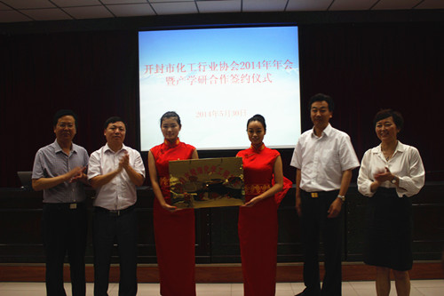 为建立完善产学研协同创新机制,加快推进高校科研成果在本地转化.5月30日上午,开封市化工行业协会年会暨产学研合作签约仪式在开封大学举行。河南大学、开封大学以及开封市40余家化工企业代表与会,开封市化工行业协会副会长许英教授主持会议。