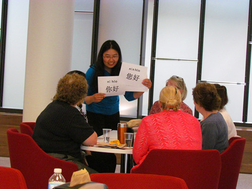 在语言教学环节,他们学习了礼貌用语,在短短的十几分钟的时间里,他们发现“j、q、x”和“z、c、s”的相近和不同,也明白了“你好”和“您好”的适用范围。在学习“干杯”时,知道酒杯的高低等等。他们对中国这么丰富的文化兴趣浓厚,会议结束以后还恋恋不舍地讨论他们感兴趣的部分。