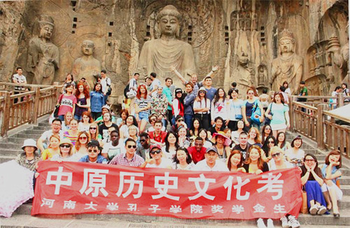 2014年5月17日,我校组织来自美国、加拿大、俄罗斯、日本、喀麦隆、老挝、蒙古、吉尔吉斯斯坦、韩国、泰国、越南等国的40余名孔子学院奖学金生赴洛阳进行石刻艺术和佛教渊源考察。