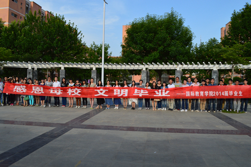 感怀母校恩情,倡导文明毕业。按照学校党委学工部在2014届毕业生中深入开展思想教育工作的相关要求,2014年5月15日下午,国际教育学院在我校金明校区南苑广场举行了“感恩母校,文明毕业”系列活动。