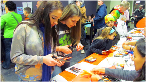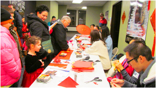 步入中国文化展厅,鲜艳的五星红旗、腾飞的小龙、“福”到了、对联、油纸伞、文房四宝、毽子等洋溢着辞旧迎新的中国风。凡是观看中国展厅的市民都会获赠一张孔子学院的新年贺卡以及自己的的汉语名字,今年还特别推出现场书法表演,方方正正的“中国字”在软软的笔端流出,市民惊叹汉字的魅力,他们跃跃欲试要用毛笔写出自己的汉语名字。为了让市民对中国文化有一个更深的了解,孔子学院工作人员现场展示和教授了“囍” 、立体 “春”等的裁剪过程,当他们亲手剪出一个个窗花的时候,中国印象就深深的烙在了他们心间。工作人员还展示了抖空竹、用筷子、踢毽子、跳皮筋等活动,吸引了众多的市民的参与,一次次把活动推向了高潮。