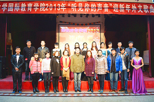 国际教育学院2013年“听见你的声音”迎新年外文歌曲演唱大赛决赛于12月25日晚在明伦校区教职工活动中心举行 。学院相关领导老师出席了本次活动。现场除评审老师打分外,特设大众评审团。