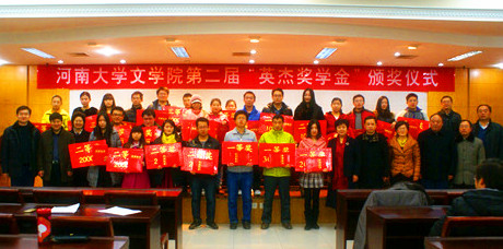 颁奖仪式上,学生处处长周保平宣读了《河南大学文学院英学奖学金实施办法》,教务处处长刘济良和研究生院常务副院长孙君健分别宣读了“英杰创作与评论奖”、“英杰学术创新奖”的获奖名单。在热烈的掌声中,获奖学生上台领奖,并与领导们合影留念。文学院2012级研究生刘鹏代表获奖学生发表感言,他真挚地表达了对文学院及英杰奖学金创办者魏杰先生的感激之情。