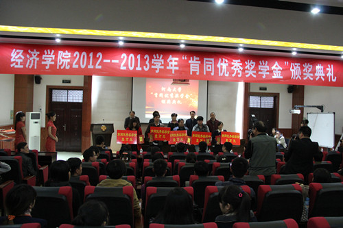 据悉,2010年以来,肯同国际集团每年出资20万元奖励经济学院20名品学兼优的学生,每人1万元,五年内共出资100万元。这是我校目前数额最高的单项奖学金。获奖学生必须品学兼优、诚实守信且每学期参加义务劳动等社会公益活动不少于10个小时。