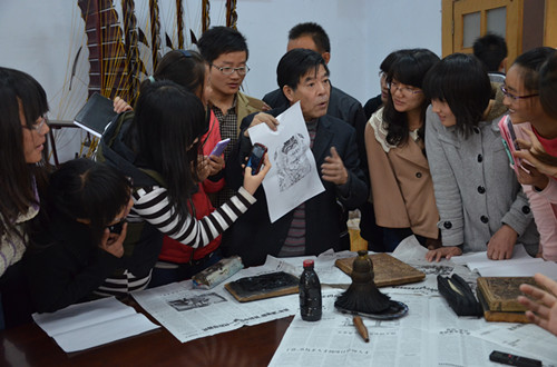 25日上午,任鹤林为河大师生现场展演了木版年画的制作工艺,他强调,木版必须在“刻”和“画”上下功夫。他说:“自从上世纪60年代初,刘铁华先生创办朱仙镇年画社起,在河大人中间似乎有一根无形的接力棒,几代河大人一直在不间断地传递,是河南大学百年名校的治学精神使然。”目前开封木版年画创作、雕版人才严重缺失,已处在发展瓶颈的关键时刻。他希望河大新一辈学人继续发扬河大优良传统,为开封传统文化的继承与保护做出新的贡献。