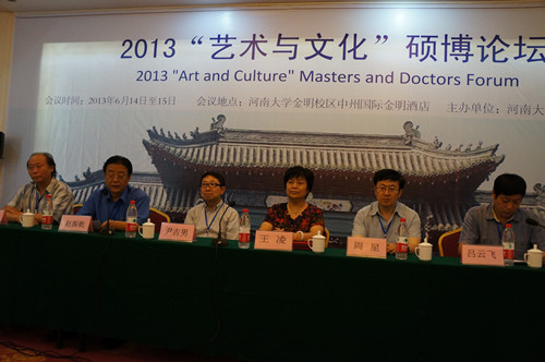 6月14日,由北京师范大学艺术与传媒学院、中央美术学院人文学院、河南大学艺术学院共同主办的2013“艺术与文化硕博论坛”在我校金明校区中州会议厅举行。参与本次论坛的包括中国艺术研究院,北京师范大学周星教授率领的博士、硕士研究生团队,中央美术学院尹吉男教授率领的博士、硕士研究生团队,郑州轻工业学院,鹤壁职业技术学院,河南大学党委副书记、艺术学院党委书记王凌,院长赵振乾等,艺术学专业全体教师及研究生参加了开幕式。开幕式由艺术学院党委常务副书记吕云飞主持。