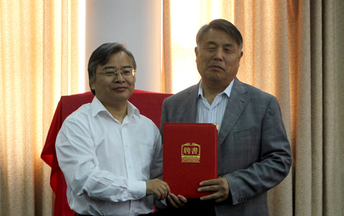 郑州航空工业管理学院院长施进发向约翰•卡萨达和河南大学经济学院教授耿明斋分别颁发河南航空经济研究中心客座教授和兼职教授聘书。