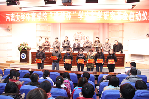 体育学院院长杨军简要介绍了基金捐助人体育学院88级校友宋江东的个人情况,他希望学生科学研究基金和“挑战杯”的结合,对激励学生参与科技实践,培养科技创新精神,提高自身综合素质,丰富和完善人才培养模式发挥积极的促进和帮助作用。体育学院党委副书记贾天明宣读了《河南大学体育学院“挑战杯”学生科学研究基金管理办法》。体育学院副院长乔凤杰简要介绍立项评审的情况,随后宣读获得资助的重点项目名单,并由到场领导、嘉宾向获得立项的学生代表颁发立项资助经费。获得基金资助的重点项目学生代表吴丽云发言,她对体育学院领导老师的帮助以及校友的支持表示感谢,郑重承诺将认真开展课题研究,力争在各级“挑战杯”赛事中创造佳绩。