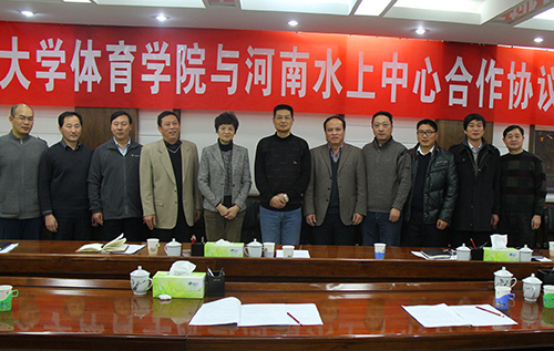 2012年12月26日,我校体育学院与河南省水上运动管理中心合作协议签字仪式在河南省体育局会议室举行。河南省体育局副局长王鹏、毛宏,省体育局备战办、竞技体育处、政策法规处、水上运动管理中心负责人,我校体育学院相关负责人、科研保障团队成员参加签字仪式。仪式由河南省水上运动管理中心主任助理张学武主持。
