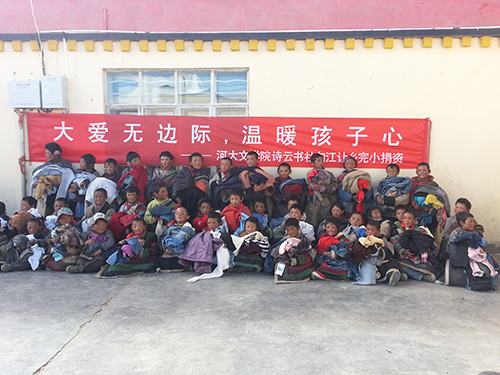 12月8日,在江让乡完全小学举办了“大爱无边际,温暖孩子心——河南大学文学院、诗云书社向江让乡完小捐资”的衣服发放活动。当地派出所所长兼乡长达瓦坚参、校长次仁参加了此次活动。校长次仁表示,感谢河南大学文学院师生心系高原边陲,用行动温暖了贫困牧民家的孩子,真正体现了大爱无边际的活动主题。