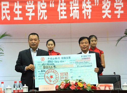 在表彰大会之前,民生学院在金明校区行政楼一楼会议室举行了“佳瑞特”奖学金签约仪式。民生学院院长施昌海与河南省佳瑞特实业集团董事长谢秋欣签署了“佳瑞特”奖学金(人民币100万元)的捐助协议,施昌海向谢秋欣颁发民生学院名誉教授的聘书。