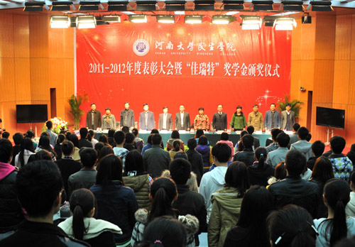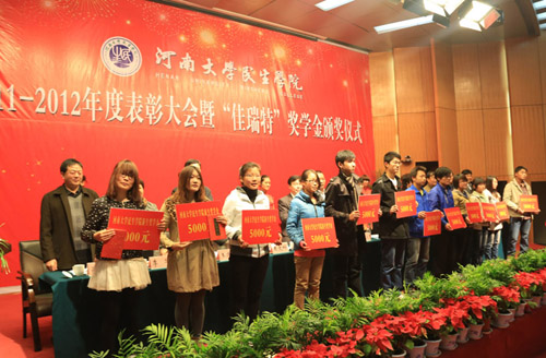2012年11月8日下午,民生学院在金明校区计算机大楼二楼报告厅举行2011-2012年度表彰大会暨“佳瑞特”奖学金颁奖仪式。校党委副书记王凌,河南佳瑞特实业集团董事长谢秋欣,民生学院院长施昌海、党委书记王国庆等党政领导及获奖师生代表与会。大会由王国庆主持。