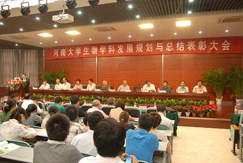 近日,金明校区生命科学学院三楼学术报告厅花团锦簇、掌声雷动,到处洋溢着节日的气氛。喜迎百年校庆,河南大学生物学科发展规划与总结表彰大会在此隆重举行。本次会议的宗旨是总结生物学科二十余年,特别是近十年来的发展道路,表彰奖励学科建设有功人员,讨论学科未来发展思路,制定学科下一步发展规划。特邀嘉宾、中国工程院院士、生命科学学院名誉院长山仑和国家自然科学基金委员会生命科学部老领导王钦南应邀参加大会并在主席台就座。校党委书记关爱和、校党委副书记王凌、副校长宋纯鹏和副校长关学增参加了大会。学校有关部处领导、环境规划学院、化学化工学院、护理学院等兄弟学院专家,生命科学学院全体教职工和研究生及本科生代表参加了大会。大会由生命科学学院院长尚富德主持。