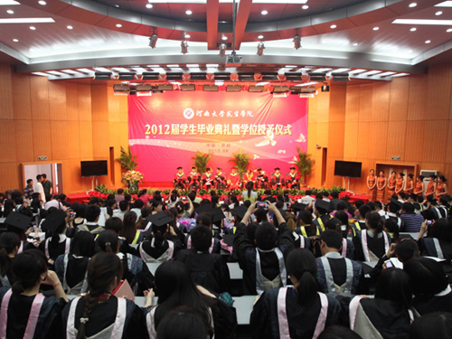 2012年6月8日上午, 河南大学民生学院2012届学生毕业典礼暨学位授予仪式在金明校区隆重举行。民生学院院长施昌海,党委书记王国庆等和学院全体教职工、在校生代表、优秀生毕业生代表以及毕业生代表家长与会。学院党委副书记楚艳霞主持了仪式。
