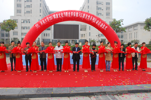 “关爱生命,珍惜青春时光;关注健康,远离不良习惯……”10月13日上午,来自各院系的学生代表齐聚于我校金明校区马可广场,郑重立下健康誓言。由校学生处、校团委主办,医学院承办的河南大学2011健康文化节暨世界保健日主题宣传系列活动启动仪式在此举行。