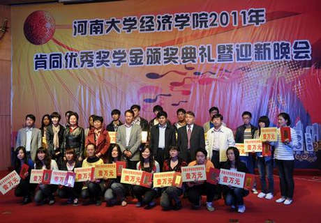 10月12日晚,经济学院2011年肯同优秀奖学金颁奖典礼暨迎新晚会在计算机大楼二楼大厅隆重举行。肯同国际集团董事长宋海聚、总经理杜丽敏,校党委副书记王凌及教务处、学生处、校团委、经济学院的有关领导和老师莅临现场。