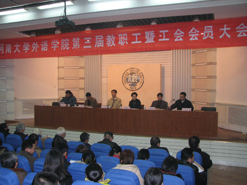 12月20日下午,外语学院第三届教职工暨工会会员大会在科技馆二楼报告厅召开,全院近百名教职工和百余名学生干部与会。校工会主席关学增等莅会指导工作,关学增代表校工会对外语学院本年度在全校率先召开二级教代会表达热烈的祝贺。院党总支书记李卫国致开幕词,院长刘辰诞总结了学院工作,副院长杨朝军宣读了提交会议讨论的有关规章制度,院工会主席史富强做了工会工作报告,学生干部代表向大会致以热烈祝贺。会议由院工会副主席朱太印主持。