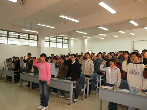 11月8日下午,学院在金明校区综合教学楼2101室召开了学生党员学习贯彻党的十七大精神动员大会。王文科同志对学生党员们提出了三点要求:一是要认真学习宣传党的十七大精神,使全院学生党员和广大学生的思想统一起来。二是要精心组织安排,切实把党的十七大精神学习好、贯彻落实好。三是要发扬我院学生在篮球比赛夺取新校区冠军的拼搏精神,从身边事做起、从点点滴滴做起,勤奋学习,健康成才。动员会上,全体学生党员进行了重温入党誓词仪式。鲜红的党旗下,在党员代表陈晴的领读下,百名学生党员紧握拳头,重温“为共产主义奋斗终生”的神圣誓言。学生党支部还隆重召开了支部大会讨论并举手表决,同意接收了崔志伟等15名同学为中共预备党员,为党支部补充了新鲜血液,壮大了党员队伍。