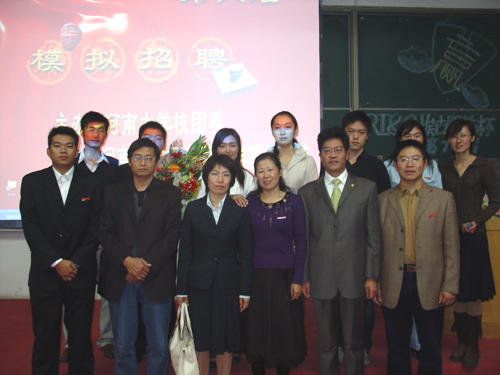 10月23日晚,由河南大学校团委主办,工商管理学院团总支承办,河南大学管理协会协办的第六届“模拟招聘”活动在河南大学金明校区综合教学楼6305教室举行。由特邀嘉宾开封特耐集团董事长张长喜先生,郑州太古可口可乐饮料有限公司人力资源部卢合芹经理,全球职业规划师、河南大学就业指导中心冯大奎教授,工商管理学院市场营销系党支部书记刘玉芳担任评委。