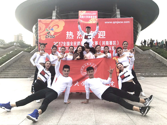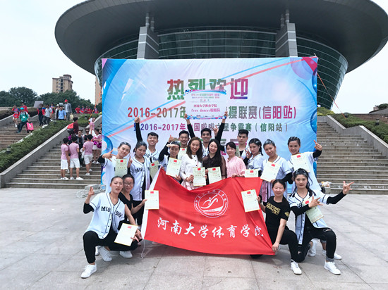 5月16日至20日,2016-2017年全国啦啦操联赛(信阳站)暨2016-2017年中国啦啦之星争霸赛(信阳站)和2017年第六届全国全民健身操舞大赛(河南赛区)暨河南省学生健身操舞锦标赛在信阳师范学院举行。体育学院学生由牛云杰副院长和张慧副院长带队代表河南大学参加乙组(体育院系组)比赛。经过激烈角逐,最终取得2个特等奖、1个第二名、1个第三名的好成绩。