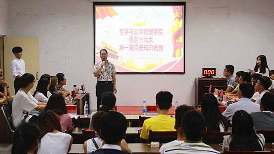 6月1日,哲学与公共管理学院在院第三会议室举办“喜迎十九大”党史知识竞赛。党史专家何云峰教授、夏和国博士担任评委嘉宾。